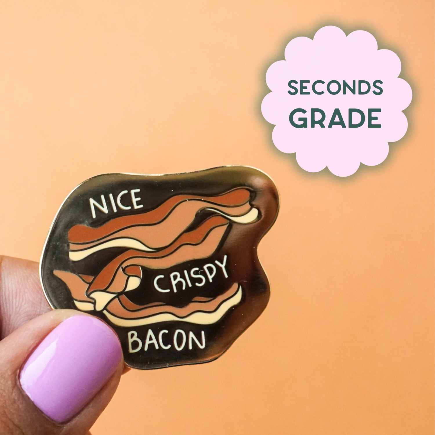 For the carnivorous hobbit folk out there. This hobbit-inspired bacon hard enamel pin is about 1.4" wide with a gold metal finish and two backposts with rubber clasps. Orders ship within 3-6 business days.