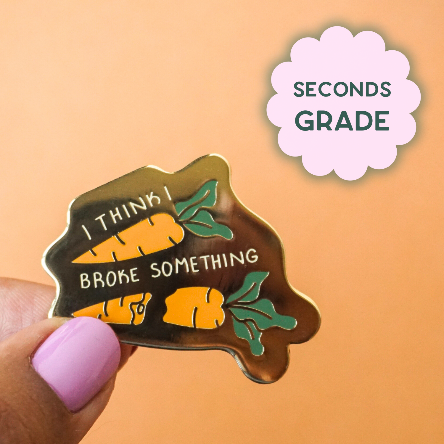 What's the worse that could happen when tumbling down a hill while carrying bags of cabbage and carrots? This hobbit-inspired hard enamel pin is about 1.4" wide with a gold metal finish and two backposts with rubber clasps. Orders ship within 3-6 business days.