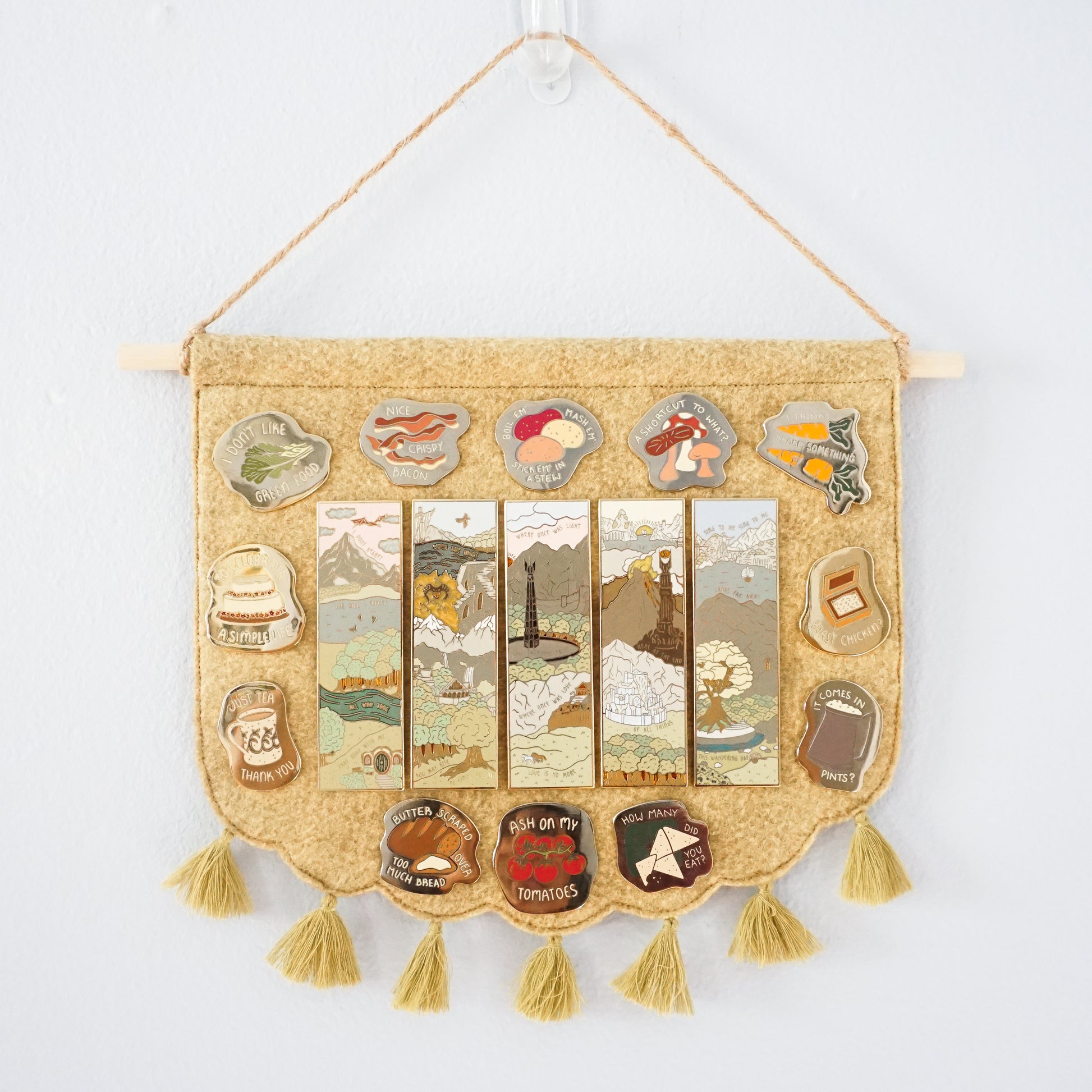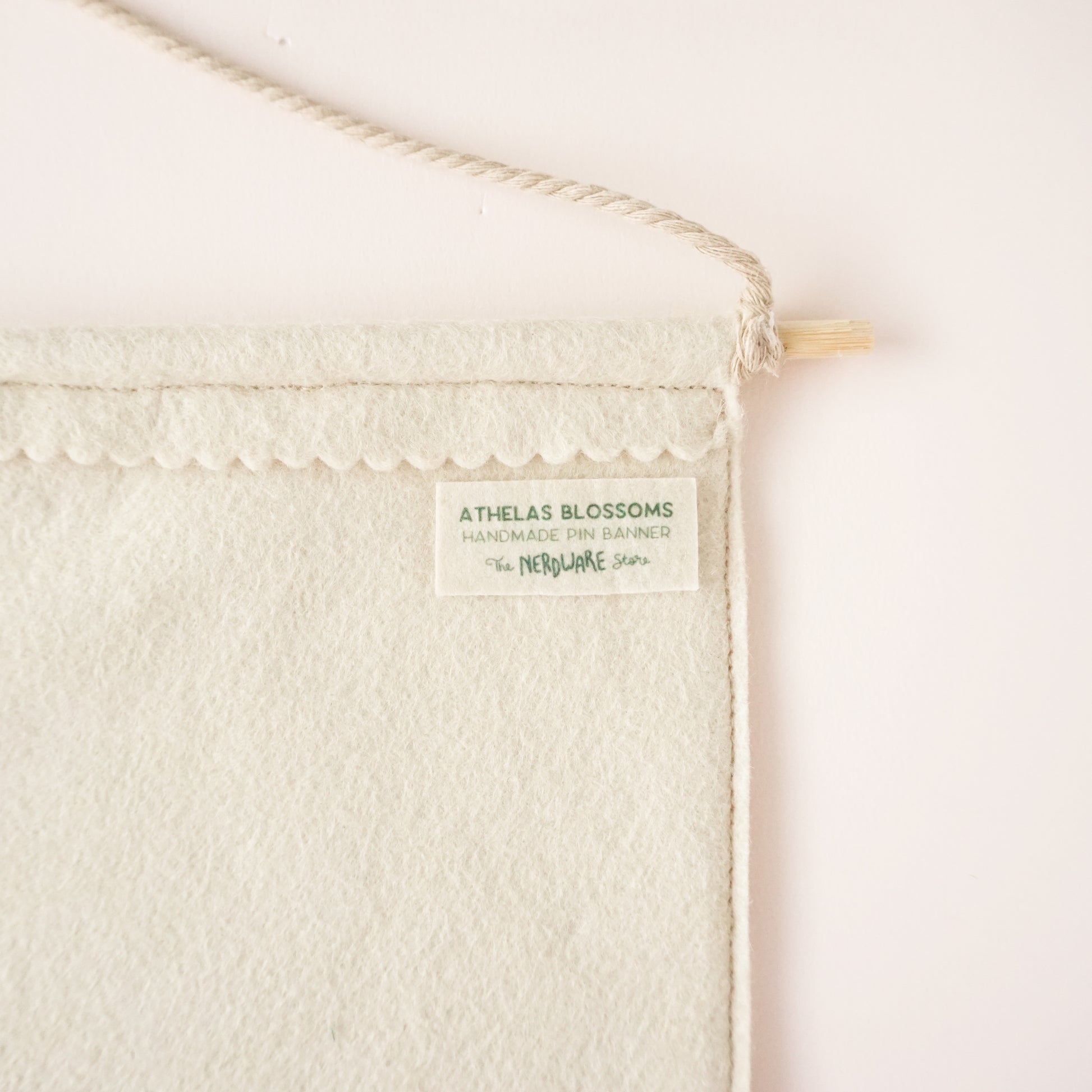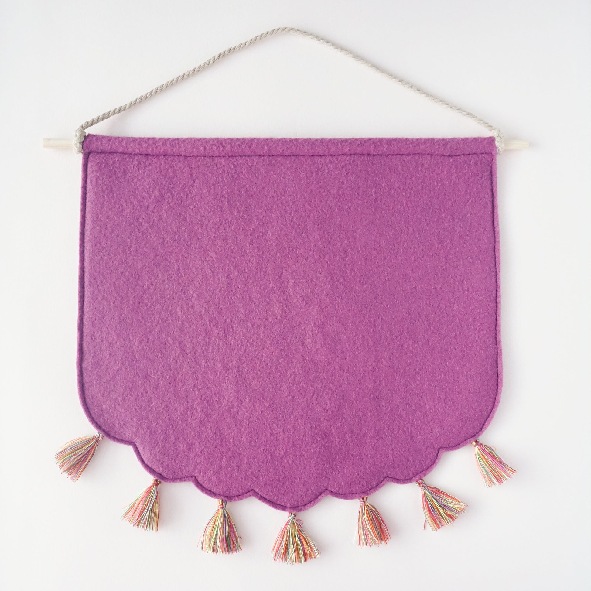 These pin banner displays are made with wool felt and are perfect for showcasing beloved pins and buttons in your living space. Pro-tip: you can arrange multiple sizes and colors of pin banners together in a gallery wall! These pin banners are about 10" wide and 9" at their longest point.
